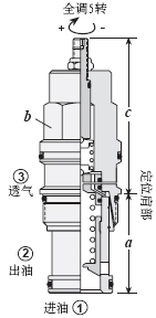 出厂设定压: A, B, C, 及 W 标准设定压 70 bar. N 标准设定压 25 bar. Q 标准设定压14 bar. * 所有调压范围设定压 5 bar. 客户可指定设定压