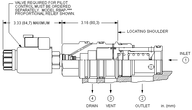 - 口4处的压力直接以1:1的比例增加到阀的设定值上,口4处的压力不能超出5000 psi(350 bar)。