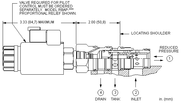 - 外泄口(口4)处的压力直接以1:1的比例增加到阀的设定值上,且压力不能超出5000 psi(350 bar)。