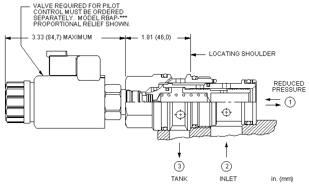 - 口3处的压力直接以1:1的比例增加到阀的设定值上,且压力不能超出3000 psi(210 bar)。